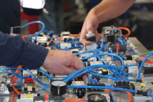 Here our current Certificate IV in Engineering students are fault finding and trouble shooting safety circuit faults on our Pneumatic simulation boards.